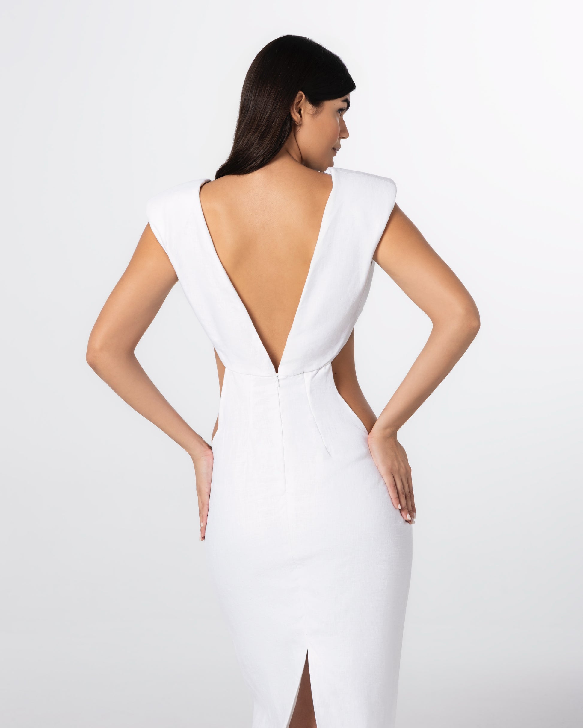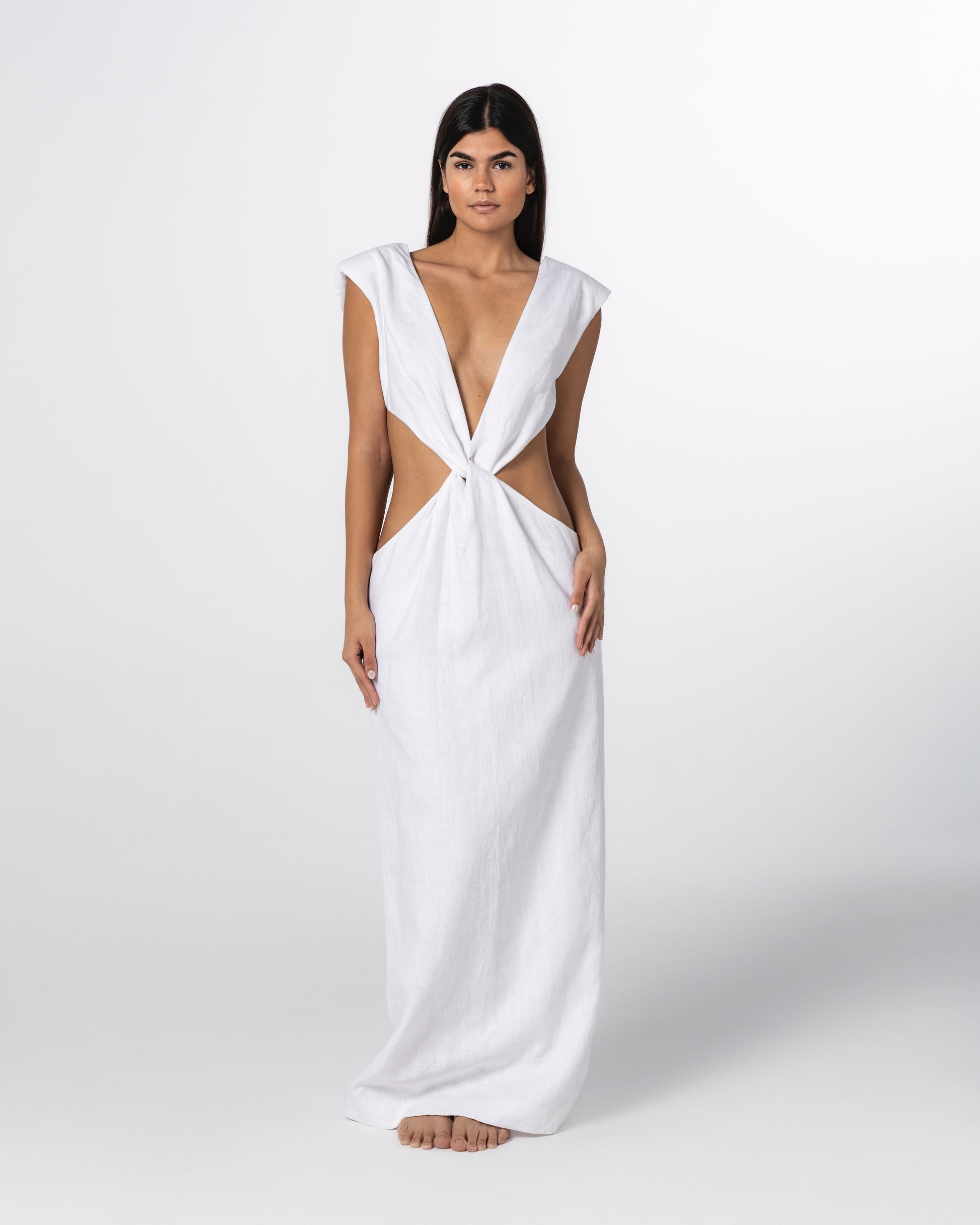 A striking silhouette crafted in 100% pure linen, this maxi-length dress features a dramatic knotted detail at the front waist, drawing attention to the midriff while enhancing shape. Designed with very open sides, strong shoulder pads, and an extreme V neckline, it makes a confident, architectural statement. The back is finished with a deep V-neckline and a hidden zipper for a clean closure.