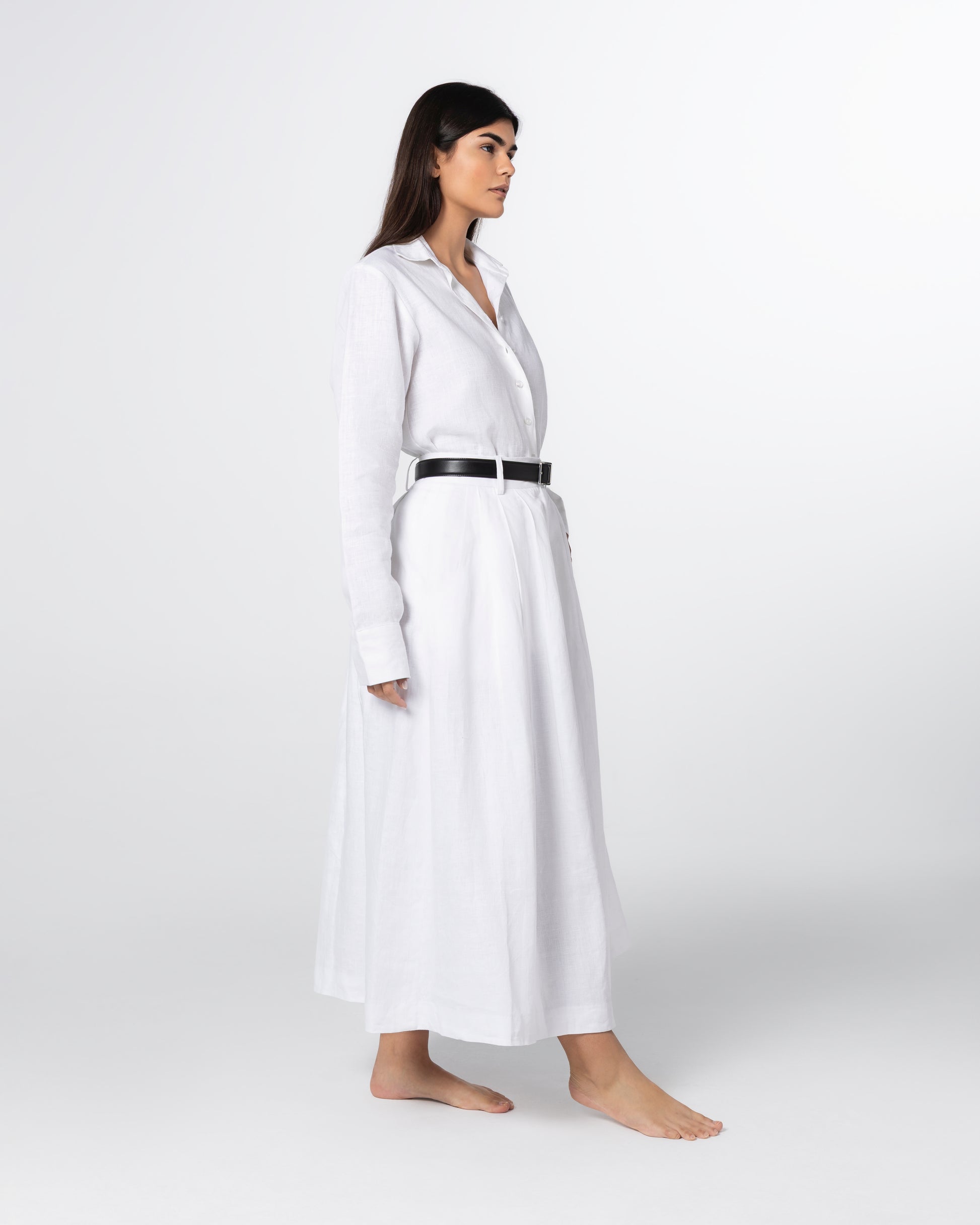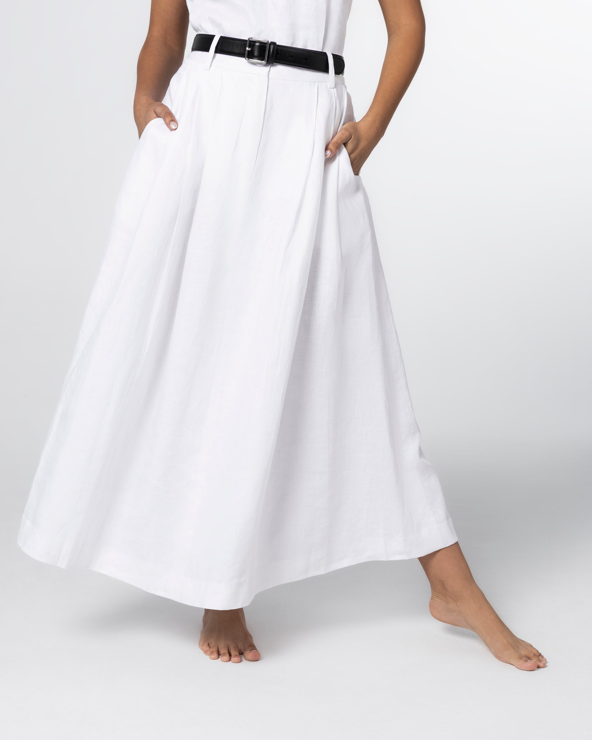 Falling just between a midi and maxi, this A-line skirt is cut from 100% pure linen for natural drape and breathability. Designed with a thicker waistband, belt loops, and darted pleats all around, it offers a timeless, smart shape that flatters the waist while remaining effortlessly floaty. Finished with side pockets for function without compromise.